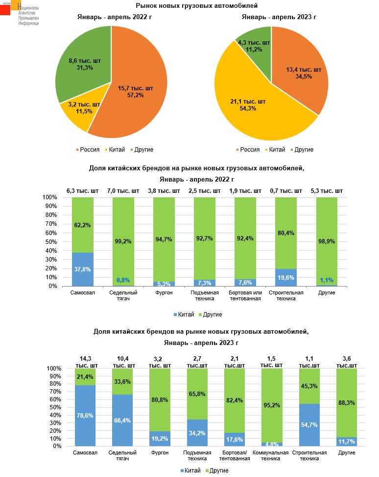 По данным маркетингового агентства НАПИ, самых существенных успехов китайские автопроизводители добились в сегменте грузовых автомобилей, где по итогам четырех месяцев текущего года они заняли 54,3% рынка, отобрав пальму первенства у российских производителей. Примечательно, что на рынке новых самосвалов доля «китайцев» достигла уже 78,6%. На рынке тягачей, где китайской техники не было до 24 февраля 2022 г., они заняли 66,4%.