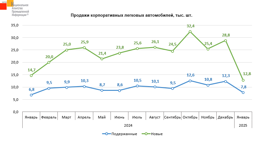 По данным маркетингового агентства НАПИ, продажи новых корпоративных легковых автомобилей в январе 2025 года снизились на 13,2% по сравнению с январем прошлого года. Пик продаж новых автомобилей корпоративным клиентам пришелся на октябрь и декабрь прошлого года. Продажи подержанных корпоративных легковых автомобилей в январе 2025 года, наоборот, выросли на 14,6%. Пик продаж подержанной техники также пришелся на октябрь и декабрь 2024 года.