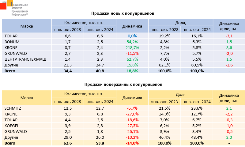 По данным маркетингового агентства НАПИ, продажи новых полуприцепов за десять месяцев 2024 года выросли на 18,8% и достигли 40,8 тыс. Лидером остался ТОНАР, хотя его доля за год сократилась на 3,1 п.п. Продажи полуприцепов KRONE взлетели на 218,7%. Рынок подержанных полуприцепов по итогам января-октября 2024 года сократился на 14%. Лидирует по продажам подержанной техники SCHMITZ, который за год нарастил долю до 23,6%.