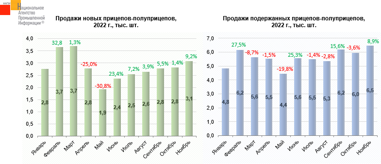 По данным маркетингового агентства НАПИ, за 11 месяцев 2022 г. было продано 31,1 тыс. новых прицепов/полуприцепов и 61,7 тыс. ед. подержанной прицепной техники. После существенного падения в апреле-мае продажи новой прицепной техники ежемесячно росли, но на уровень февраля-марта так и не вышли. Спад продаж подержанных прицепов/полуприцепов был не таким существенным, в ноябре продажи подержанных прицепов/полуприцепов превзошли показатели февраля текущего года.