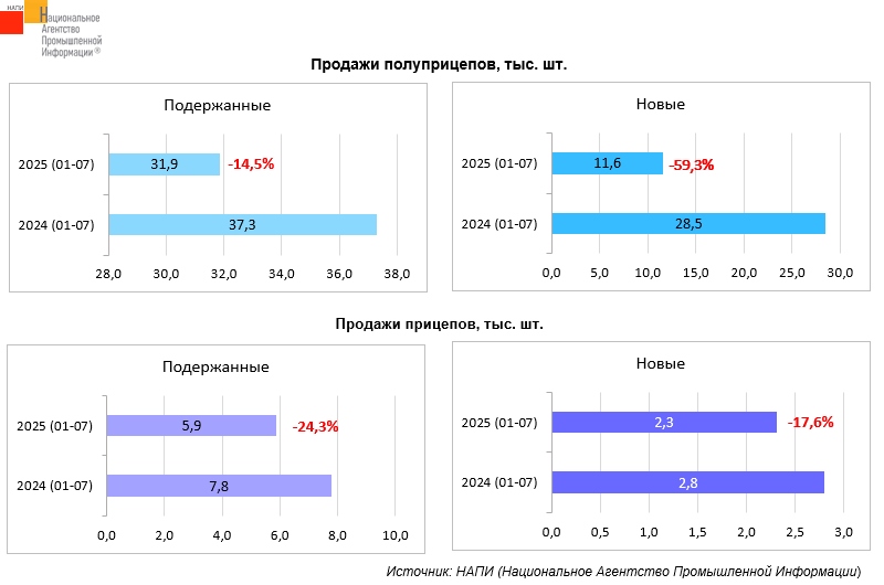 Маркетинговое агентство НАПИ проанализировало продажи прицепов и полуприцепов в январе-июле 2025 года. За семь месяцев текущего года было продано 51,7 тыс. единиц новых и подержанных прицепов и полуприцепов, что на 32,3% меньше, чем за аналогичный период 2024 года. На рынке новой техники продажи полуприцепов упали на 59,3%, прицепов – снизились на 17,6%. Закупки подержанных полуприцепов сократились на 14,5%, прицепов – на 24,3%.