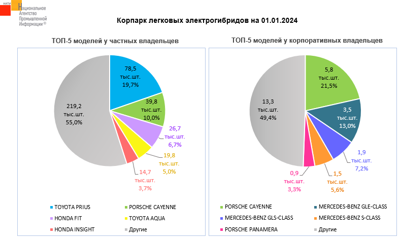 Маркетинговое агентство НАПИ проанализировало самые популярные легковые электрогибриды у частных и корпоративных владельцев. В корпоративном парке первое место занял PORSCHE CAYENNE с долей 21,5%. Частные владельцы предпочитают TOYOTA PRIUS, на долю которой пришлось 19,7%. Гибридный PORSCHE CAYENNE занял второе место по популярности у частных владельцев, но доля его существенно меньше, чем в корпоративном парке. Всего же в парке у частных владельцев находится 398,6 тыс. легковых электрических гибридов всех типов. Корпарк легковых электрогибридов насчитывает 27 тыс.
