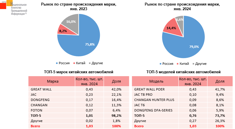 По данным маркетингового агентства НАПИ, доля китайских легких коммерческих автомобилей (LCV)* в январе 2024 г. увеличилась с 8,2% до 14,4%. Продажи китайской техники выросли на 153,8%, тогда как весь рынок вырос на 45,7%. Самыми популярными китайскими автомобилями стали пикапы GREAT WALL POER, JAC T8 PRO, CHANGAN HUNTER PLUS.