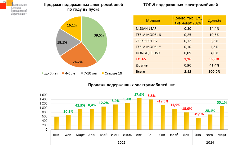 По данным маркетингового агентства НАПИ, продажи подержанных электромобилей за январь-март текущего года выросли на 5,1% по сравнению с первым кварталом прошлого года. Наибольшим спросом пользуются «свежие» электромобили (возрастом до трех лет включительно), на их долю приходится почти 40% рынка подержанной техники. Самый популярный подержанный электромобиль - NISSAN LEAF, за три месяца текущего года было продано 0,8 тыс. таких электромобилей. В структуре продаж подержанных NISSAN LEAF на электромобили старше 10 лет приходится 44,6%.