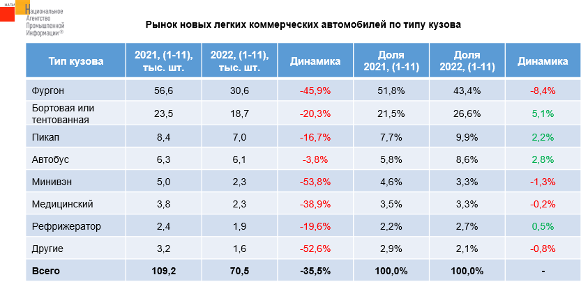 По данным НАПИ продажи новых легких коммерческих автомобилей за 11 месяцев 2022 г. сократились на 35,5%. Больше всего за этот период было продано фургонов, хотя их доля сократилась на 8,4% по сравнению с аналогичным периодом прошлого года. Не так сильно в текущем году снизились продажи в бортовой/тентованной техники, пикапов, автобусов, что позволило этим типам автомобилей нарастить долю на рынке.