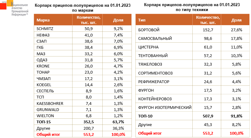 По данным маркетингового агентства НАПИ, корпарк прицепов-полуприцепов на 01.01.2023 г. насчитывает 553,2 тыс. шт. Самый популярный бренд прицепной техники у корпоративных клиентов – SCHMITZ, на его долю приходится чуть больше 9% корпоративного парка.