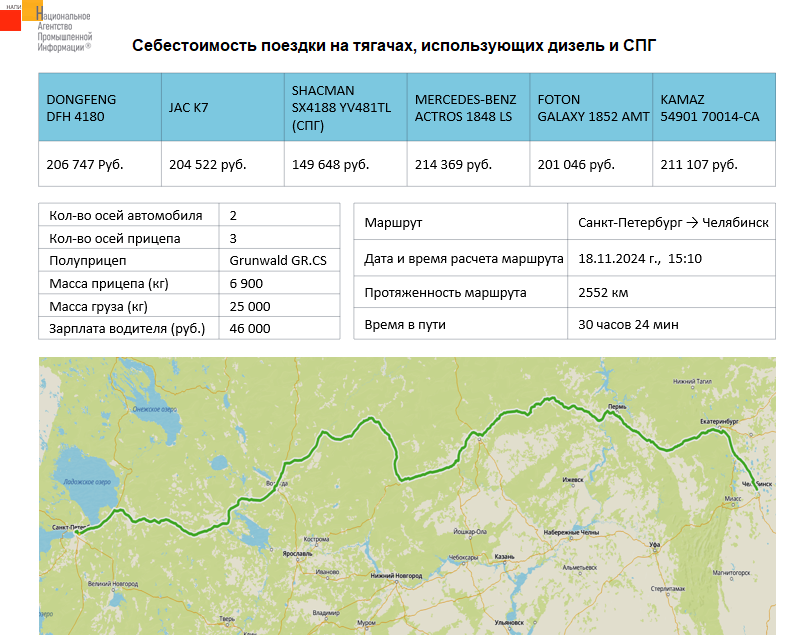 Маркетинговое агентство НАПИ проанализировало себестоимость доставки груза 25 тонн на седельных корпоративных тягачах 4х2 из Санкт-Петербурга в Челябинск. Длительность поездки и маршрут определены в соответствии с дорожной ситуацией на момент расчета, длина маршрута составила 2552 км. Затраты на поездку учитывают все затраты при владении автомобилем в течении 5 лет, актуальные цены на топливо на момент расчета маршрута, стоимость проезда по платным дорогам. Зарплата водителя включена в расчет, время в пути не включает периоды отдыха водителя.