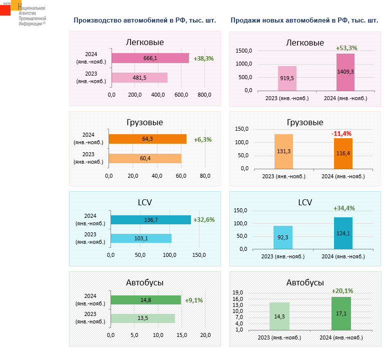 Маркетинговое агентство НАПИ проанализировало данные по производству и продажам новых автомобилей в январе-ноябре 2024 г.