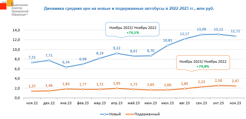 Средние цены на новые автобусы с ноября 2022 г. по ноябрь 2023 г. выросли на 74,1% и достигли 12,72 млн. руб. По сравнению же с октябрем цены на новые автобусы снизились на 3,0%.