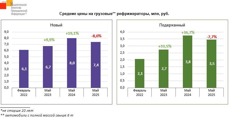 Маркетинговое агентство НАПИ проанализировало динамику средних цен на новые и подержанные* грузовые** рефрижераторы. Средняя цена на новый рефрижератор в мае 2025 года достигла 7,4 млн. руб., что на 21,3% больше, чем в феврале 2022 года. По сравнению с маем прошлого года новые рефрижераторы в среднем подешевели на 8,0%. Средняя цена на подержанный рефрижератор в мае 2025 года составила 3,5 млн. руб., что на 66,7% больше, чем в феврале 2022 года. По сравнению же с маем прошлого года средняя цена на подержанный рефрижератор снизилась на 7,7%.