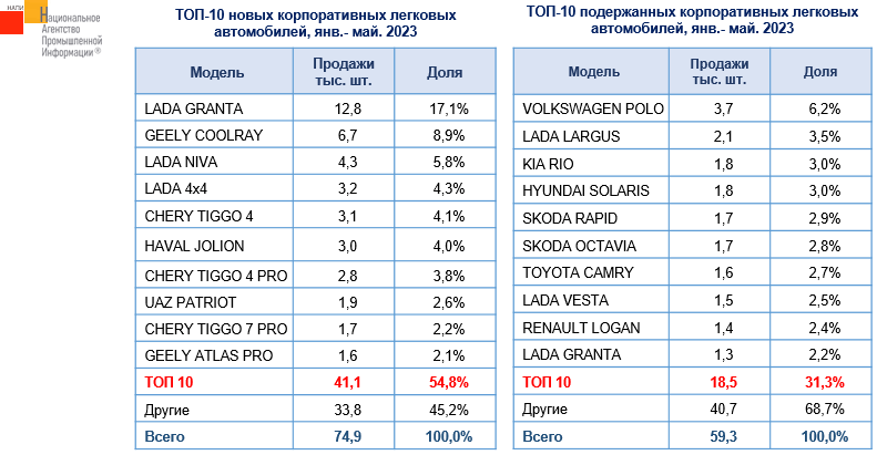 По данным маркетингового агентства НАПИ, за пять месяцев текущего года корпоративные клиенты приобрели 74,9 тыс. новых легковых автомобилей, что на 4% больше, чем годом ранее. А вот продажи подержанных автомобилей «корпоратам» выросли на 46%, с 40,6 тыс. по итогам января-мая 2022 г. до 59,3 тыс. по итогам пяти месяцев текущего года. В десятку лидеров по подержанной технике вошли в основном автомобили, которые официально не поставляются и не производятся в России.