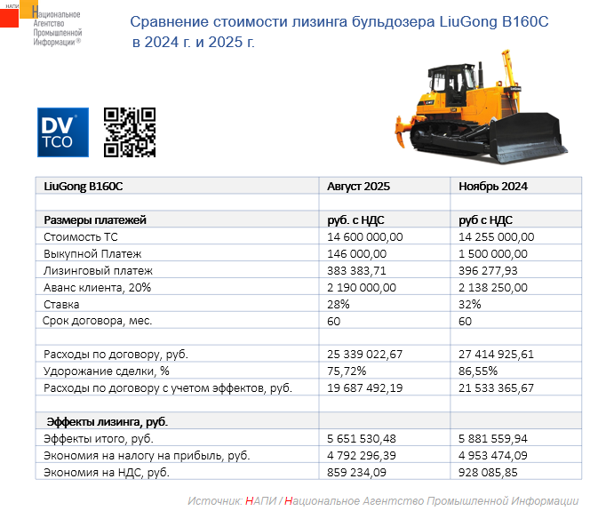 Маркетинговое агентство НАПИ проанализировало стоимость лизинга бульдозера марки LiuGong B160C в ноябре 2024 года и августе 2025 года с использованием онлайн калькулятора стоимости владения DV – TCO.