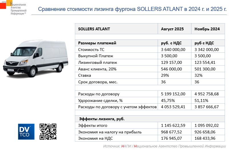 Маркетинговое агентство НАПИ проанализировало стоимость лизинга грузопассажирского фургона SOLLERS ATLANT в ноябре 2024 года и августе 2025 года с использованием онлайн калькулятора стоимости владения DV – TCO.