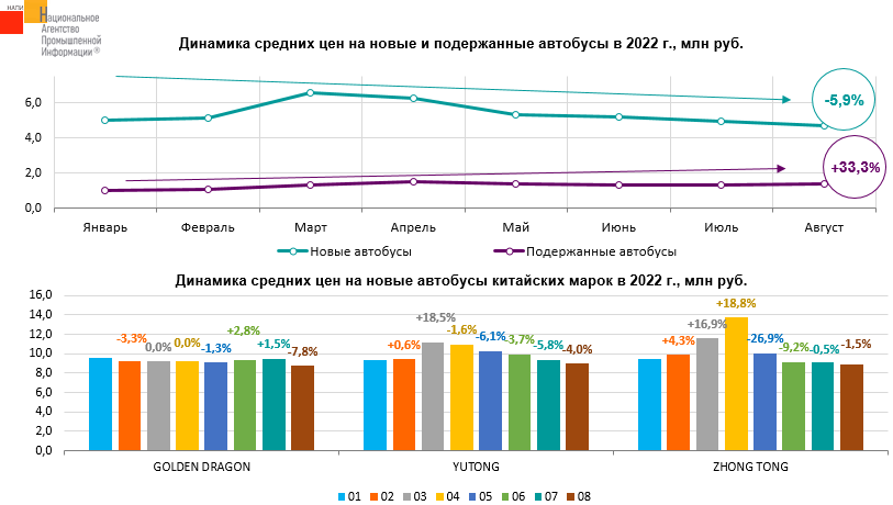 Согласно данным НАПИ (Национальное Агентство Промышленной Информации) средняя цена на новые автобусы * в августе 2022 г. достигла отметки в 4,7 млн. руб. По сравнению с январем 2022 г. , когда средняя цена на автобусы составляла 5 млн. руб., новые автобусы подешевели на 5,9%. С апреля средняя цена снижалась, в основном за счет сокращения предложений по иностранным автобусам.
