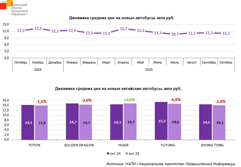 По данным маркетингового агентства НАПИ, средняя цена на новые автобусы* за год, с октября 2024 по октябрь 2025 года, сократилась на 1,2 млн рублей (-9,8%). За месяц, с сентября по октябрь 2025 года, снижение средней цены составило 148 тыс. рублей (-1,3%).
