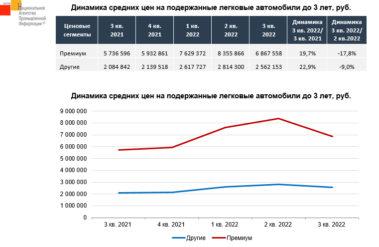 Маркетинговое агентство НАПИ (Национальное Агентство Промышленной Информации) проанализировало динамику средних цен на подержанные легковые автомобили с 3 квартала 2021 года по 3 квартал 2022 г. Анализировались цены на премиальные автомобили и автомобили других ценовых сегментов (бюджетных и средних). Наибольшего значения средние цены на автомобили возрастом до трех достигли во 2 квартале текущего года. В третьем квартале произошла коррекция цен по сравнению со вторым кварталом текущего года, сильнее всего снизилась средняя цена на премиальные автомобили (-17,8%).