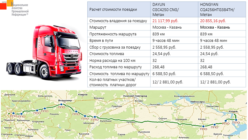 Маркетинговое агентство НАПИ проанализировало стоимость поездки на корпоративных грузовых тягачах DAYUN CGC4250 CNG и HONGYAN CQ4256HTG384TH из Москвы в Казань. Оба тягача используют метан. Длительность поездки и маршрут определены в соответствии с дорожной ситуацией на момент расчета, длина маршрута составила 839 км. Затраты на поездку учитывают все затраты при владении автомобилем в течении 5 лет, актуальные цены на топливо на момент расчета маршрута, стоимость проезда по платным дорогам. Зарплата водителя в расчет не входит, время в пути не включает периоды отдыха водителя.