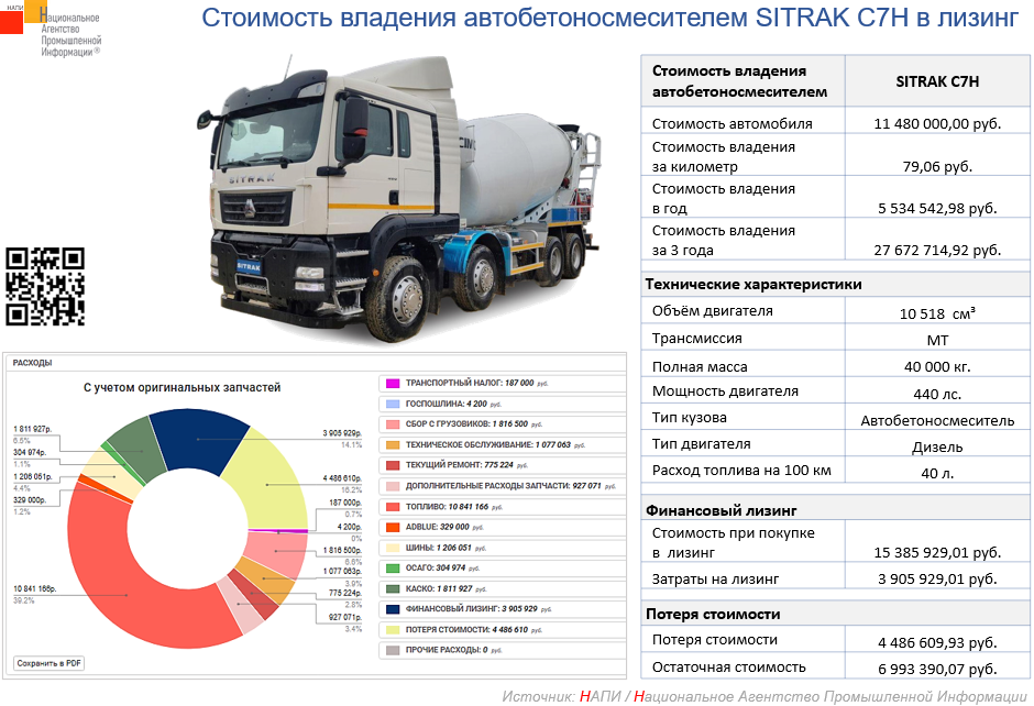 Маркетинговое агентство НАПИ проанализировало стоимость владения автобетоносмесителем SITRAK C7H ZZ5316JBV306ME V=12м с использованием онлайн калькулятора стоимости владения DV – TCO.