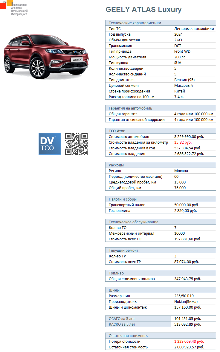 Маркетинговое агентство НАПИ (Национальное Агентство Промышленной Информации) проанализировало стоимость владения автомобилем GEELY ATLAS Luxury.
