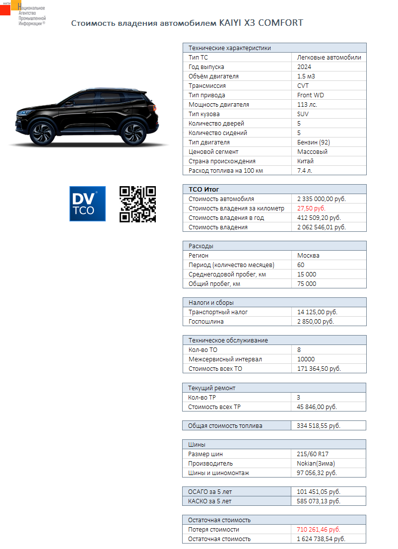 Маркетинговое агентство НАПИ (Национальное Агентство Промышленной Информации) проанализировало стоимость владения автомобилем KAIYI X3 COMFORT.