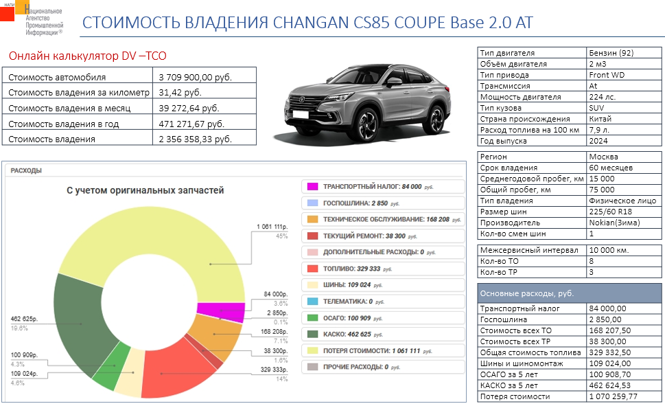 Маркетинговое агентство НАПИ (Национальное Агентство Промышленной Информации) проанализировало стоимость владения автомобилем CHANGAN CS85 COUPE Base 2.0 AT.