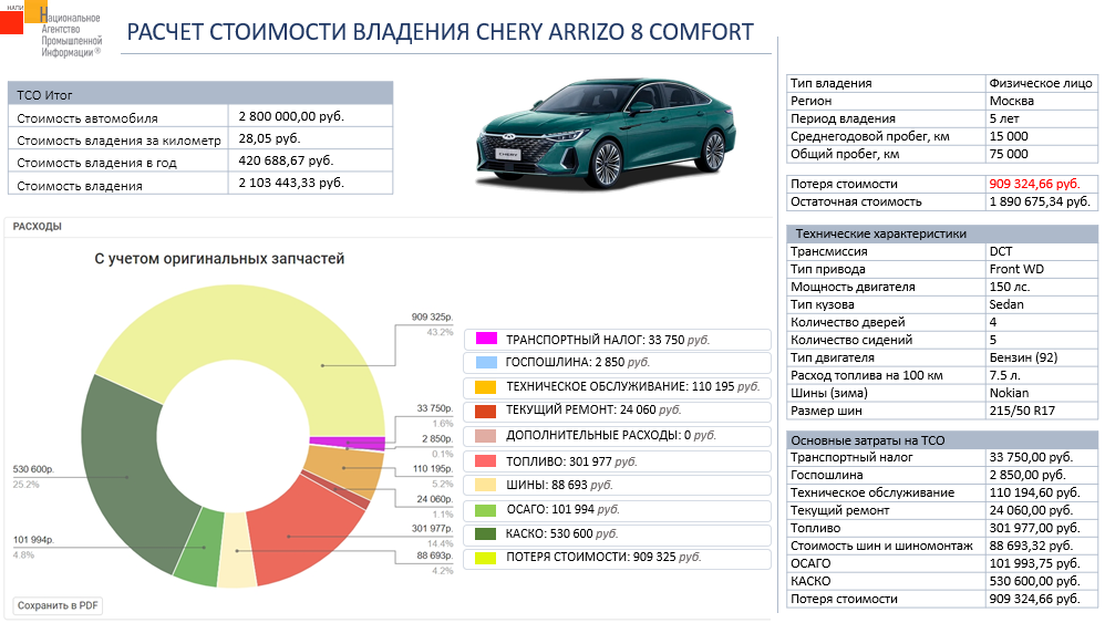 Маркетинговое агентство НАПИ (Национальное Агентство Промышленной Информации) проанализировало стоимость владения автомобилем CHERY ARRIZO 8 Comfort.