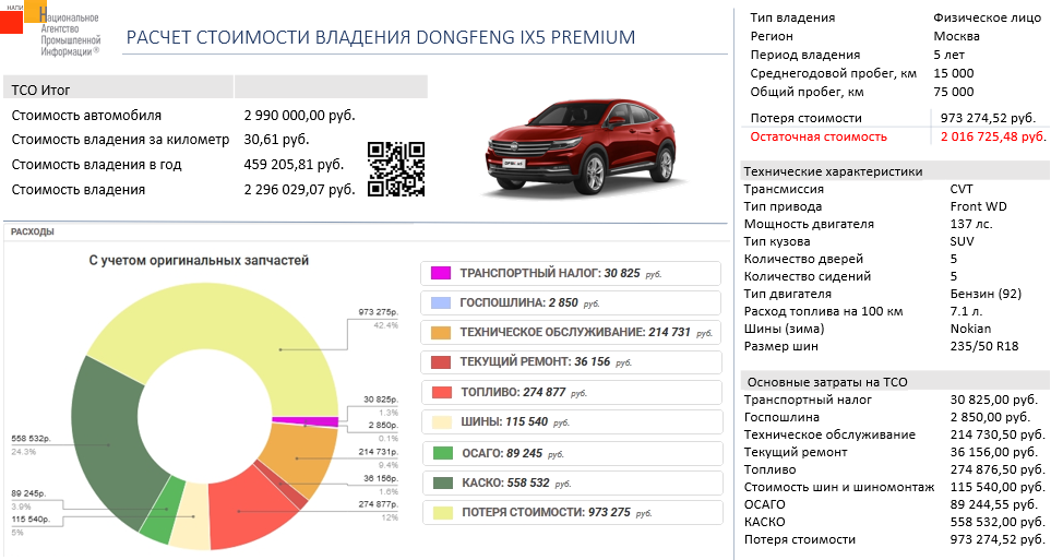 Маркетинговое агентство НАПИ (Национальное Агентство Промышленной Информации) проанализировало стоимость владения автомобилем DONGFENG IX5 Premium.