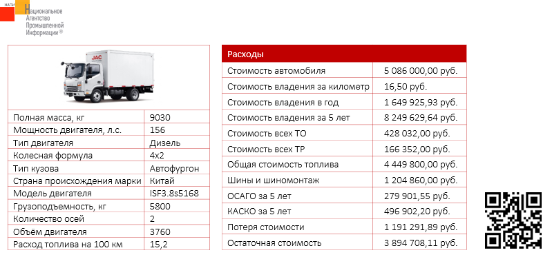 Маркетинговое агентство НАПИ (Национальное Агентство Промышленной Информации) проанализировало стоимость владения грузовым автомобилем JAC N90 в июне 2023г.