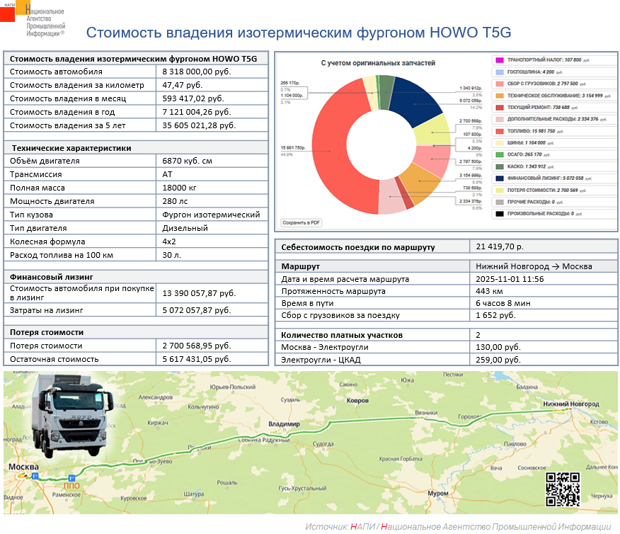 Также рассчитана себестоимость поездки HOWO T5G по маршруту Нижний Новгород → Москва с учетом стоимости владения.