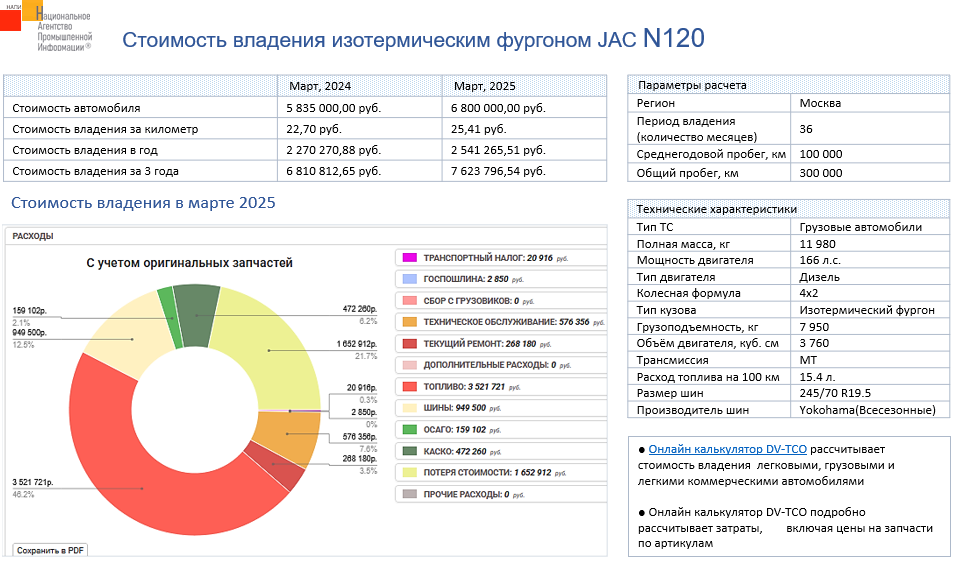 Маркетинговое агентство НАПИ проанализировало стоимость владения грузовым изотермическим фургоном JAC N120 в корпоративном парке в Москве с использованием онлайн калькулятора стоимости владения DV – TCO. За год, с марта 2024 по март 2025 года, стоимость владения за км пробега увеличилась на 2,71 руб.