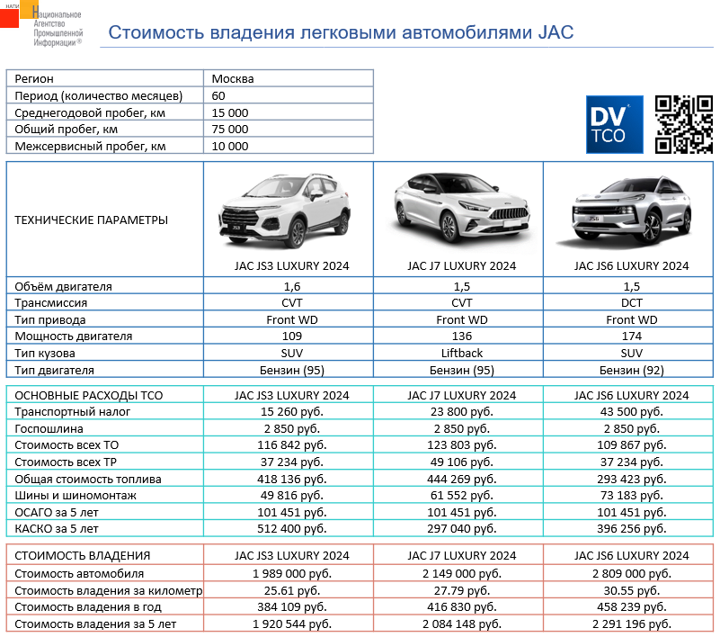 Маркетинговое агентство НАПИ проанализировало стоимость владения легковыми автомобилями марки JAC за 5 лет у физических лиц в Москве, используя онлайн калькулятор стоимости владения DV – TCO. В стоимость владения включена потеря стоимости автомобиля.