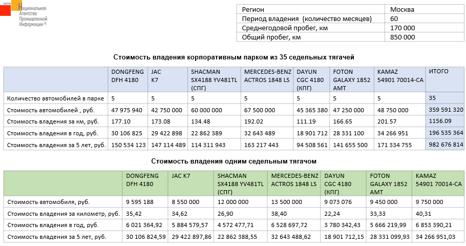 Маркетинговое агентство НАПИ проанализировало стоимость владения корпоративным парком из 35 седельных тягачей. В стоимость владения включена потеря стоимости автомобиля, затраты на топливо, AdBlue, шины, шиномонтаж, техническое обслуживание, технический ремонт, ОСАГО, КАСКО, Платон, госпошлина, транспортный налог.