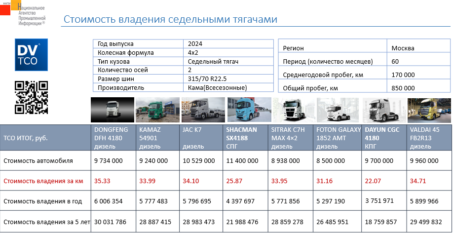 Маркетинговое агентство НАПИ проанализировало стоимость владения популярными седельными тягачами 4х2, использующих дизельное топливо, КПГ и СПГ.