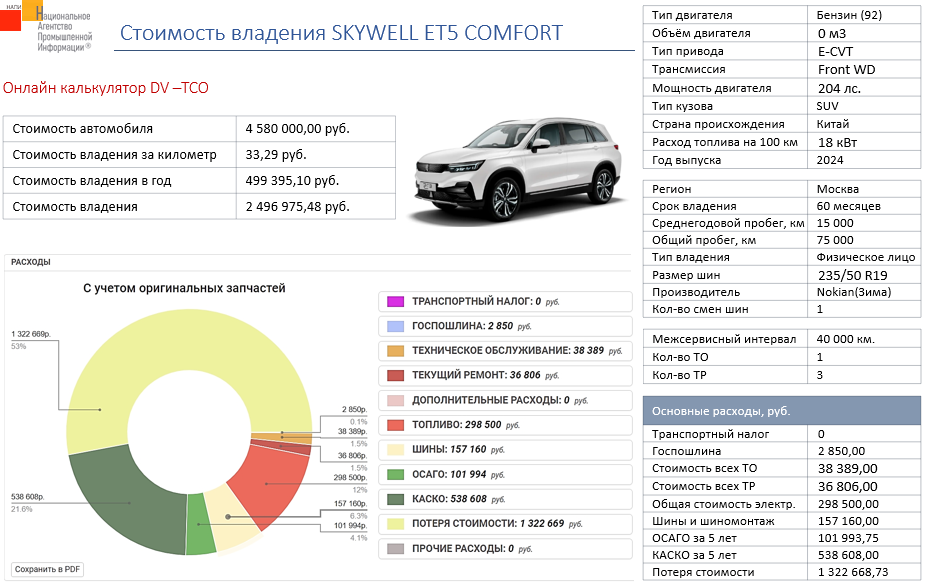 Маркетинговое агентство НАПИ (Национальное Агентство Промышленной Информации) проанализировало стоимость владения электромобилем SKYWELL ET5 COMFORT .