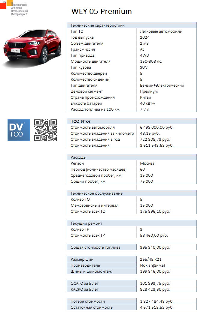 Маркетинговое агентство НАПИ (Национальное Агентство Промышленной Информации) проанализировало стоимость владения автомобилем WEY 05 Premium.
