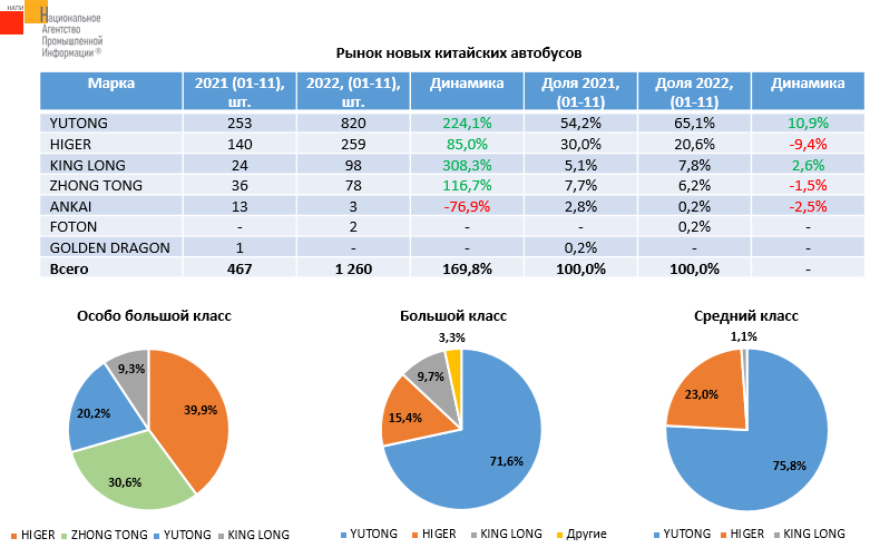 По данным маркетингового агентства НАПИ продажи новых китайских автобусов за 11 месяцев текущего года выросли на 169,8%. Лидером по темпам прироста стал бренд KING LONG (+308,3%), лидером по продажам – YUTONG (820 шт.). В основном китайские автобусы представлены в особо большом, большом и среднем классах. В структуре продаж китайских автобусов особо большого класса лидирует HIGER с долей 39,9%, в структуре продаж китайских автобусов большого и среднего классов – YUTONG с долей 71,6% и 75,8% соответственно.