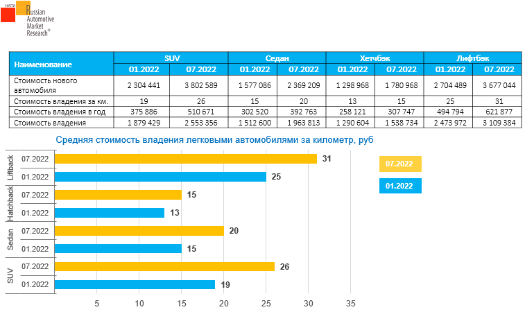 Темпы роста ТСО легковых автомобилей с кузовом SUV массового сегмента составили почти 40%, а в абсолютных значениях 26 рублей за 1 км. против 19 рублей в январе 2022 г