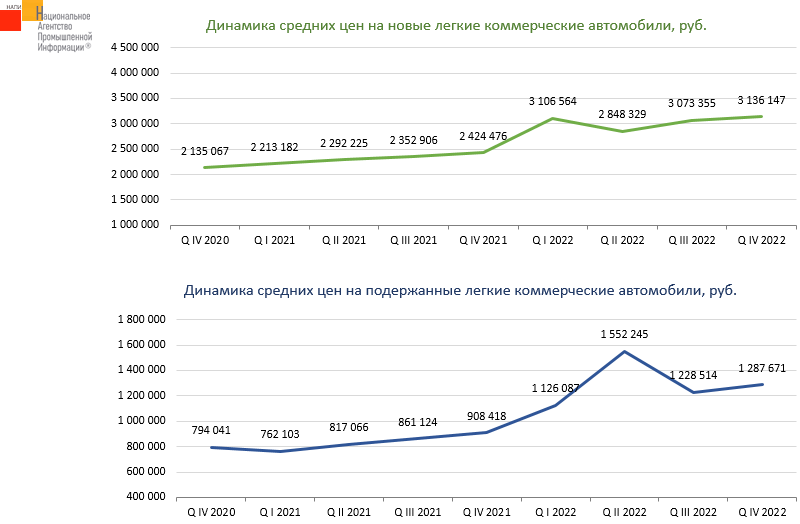 Согласно данным НАПИ (Национальное Агентство Промышленной Информации), по итогам 4 квартала 2022 года средняя цена на новые легкие коммерческие автомобили (РРЦ) выросла на 2,0% по сравнению с 3 кварталом 2022 года. Средняя цена на подержанные автомобили (по крупнейшим интернет-агрегаторам) в четвертом квартале прошлого года выросла на 4,8% по сравнению с 3 кварталом. За год, по сравнению с 4 кварталом 2021 года, средняя цена на новую технику увеличилась на 29,4%, средняя цена на подержанную технику – на 41,7%.