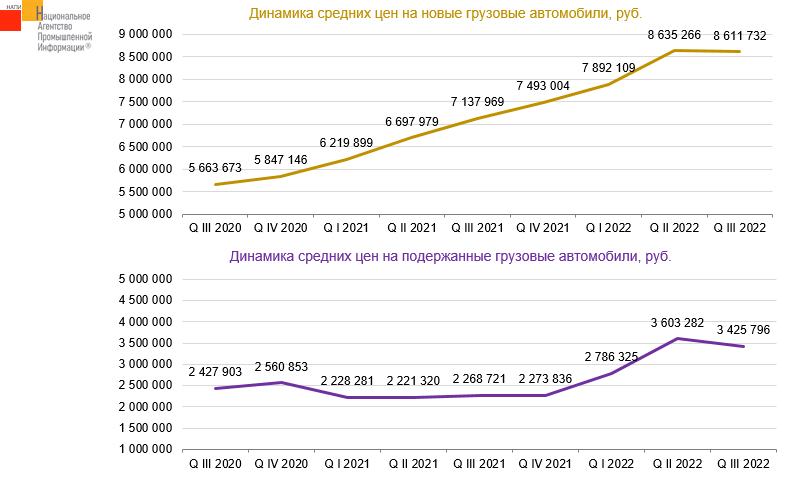 Согласно данным НАПИ (Национальное Агентство Промышленной Информации) по итогам 3 квартала 2022 года произошла коррекция средних цен на новые и подержанные грузовики. Средние цены на новые грузовые автомобили снизились на 0,3% по сравнению со 2 кварталом 2022 года и составили 8,6 млн. руб. Средние цены на подержанные грузовики снизились на 4,9% по сравнению со 2 кварталом и составили 3,4 млн. руб.