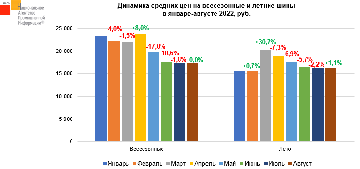 Агентство НАПИ(Национальное Агентство Промышленной Информации) проанализировало динамику цен на новые шины в январе-августе 2022 г. по всем представленным на российском рынке типоразмерам для легковых, легких коммерческих, грузовых автомобилей.