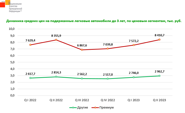 Маркетинговое агентство НАПИ (Национальное Агентство Промышленной Информации) проанализировало динамику средних цен на подержанные легковые автомобили с 1 квартала 2022 года по 2 квартал 2023 года. Пик роста цен на подержанные автомобили премиального и других ценовых сегментов (бюджетный и массовый) возрастом до 3 лет включительно пришелся на второй квартал 2022 года. По итогам же второго квартала текущего года средняя цена на «свежие» премиальные автомобили превзошла пиковые значения годичной давности на 0,7%, средняя цена бюджетных и массовых автомобилей - на 5,3%.
