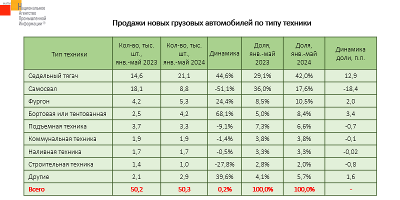 По данным маркетингового агентства НАПИ за пять месяцев 2024 года существенно сократились продажи новых самосвалов и строительной техники, на 51,1% и 27,8% соответственно. В тоже время продажи седельных тягачей, бортовой или тентованной техники, фургонов существенно выросли. В целом рынок новых грузовых автомобилей по итогам января-мая 2024 года вырос всего на 0,2% по сравнению с аналогичным периодом прошлого года.
