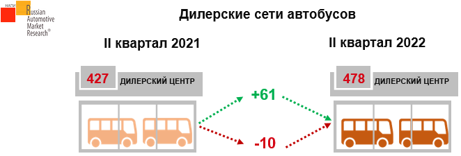 По данным НАПИ (Russian Automotive Market Research), во втором квартале 2022 г. в России насчитывается 478 центров продаж новых автобусов, что на 51 автоцентр больше, чем годом ранее.