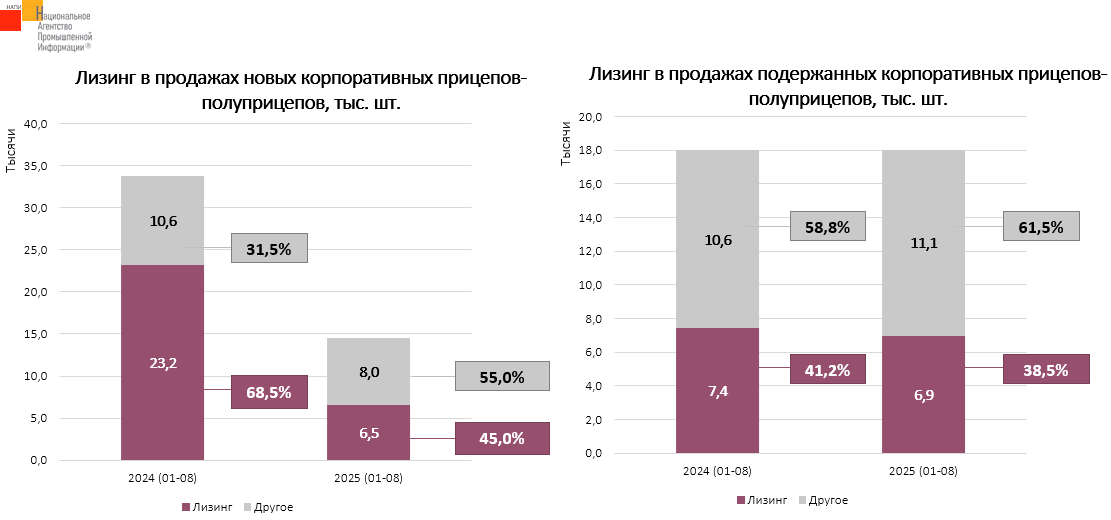 На долю лизинга в продажах новых прицепов-полуприцепов в январе-августе 2024 года приходилось 68,5%, в аналогичный период 2025 года доля сократилась до 45%. На долю лизинга в продажах подержанных прицепов-полуприцепов в 2024 году приходилось 41,2%, в текущем году она снизилась до 38,5%.