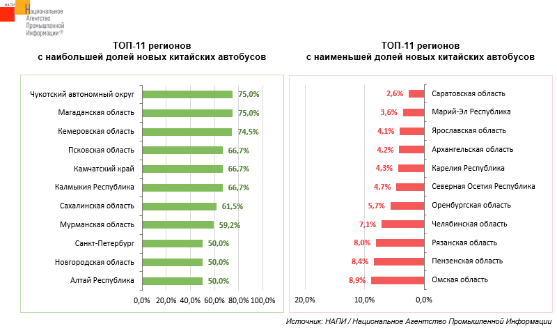 За восемь месяцев текущего года, регионами, где три четвери общего объема приобретенных новых автобусов приходится на китайские марки, стали Чукотский автономный округ, Магаданская область, Кемеровская область. Наименьшую долю китайской техники можно наблюдать в Саратовской области (2,6%), Республике Марий-Эл (3,6%) и Ярославской области (4,1%).