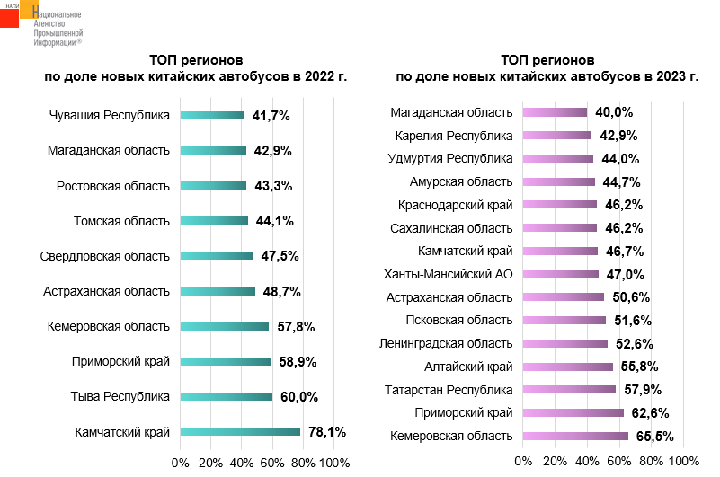 Маркетинговое агентство НАПИ проанализировало продажи новых китайских автобусов в России. За год доля новых китайских автобусов выросла с 13,5% по итогам 2022 года до 21,1% по итогам прошлого года. В семи регионах в прошлом году больше 50% проданных новых автобусов были китайскими. В 2022 году таких регионов было только четыре.