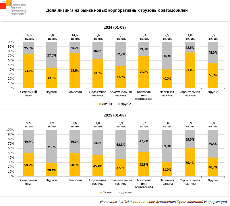 По данным маркетингового агентства НАПИ, за январь-август 2025 года в финансовый лизинг корпоративным клиентам было выдано 15,8 тыс. новых грузовых автомобилей*, что на 70,2% меньше, чем за аналогичный период 2024 года, когда в лизинг было поставлено 52,9 тыс. новых грузовиков. Доля лизинга в продажах новых грузовиков за год сократилась с 67,1% до 43,8%.
