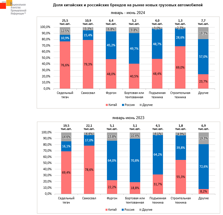 По данным маркетингового агентства НАПИ, по итогам января-июня 2024 г. доля китайской техники на рынке новых грузовых автомобилей достигла 62,3%. Годом ранее китайские грузовики занимали 56,5% рынка. Наибольший прирост доли китайских грузовых автомобилей наблюдался в таких сегментах как фургоны, бортовая или тентованная техника, подъемная техника. Доля российских брендов за год сократилась с 33,2% до 27,3%.