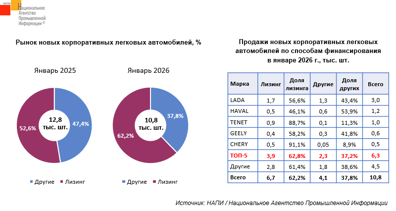 По данным маркетингового агентства НАПИ, в январе 2026 года корпоративным клиентам было продано 10,8 тыс. ед. новых легковых автомобилей, в том числе 6,7 тыс. ед. – в финансовый и операционный лизинг.