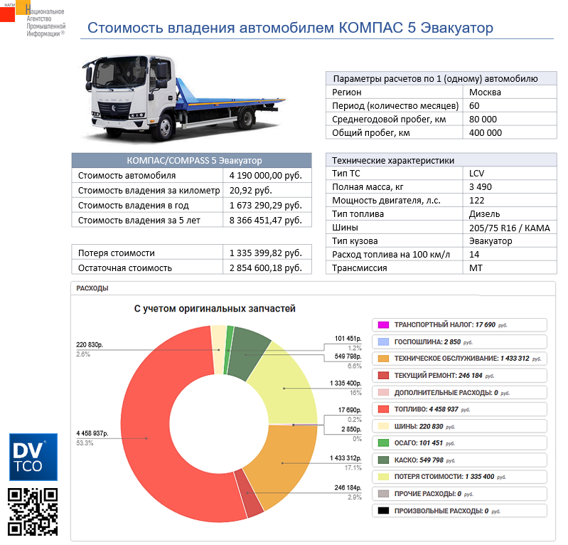 Маркетинговое агентство НАПИ проанализировало стоимость владения автомобилем марки КОМПАС 5 с типом кузова Эвакуатор в корпоративном парке в Москве с использованием онлайн калькулятора стоимости владения DV – TCO. В стоимость владения включена потеря стоимости автомобиля.